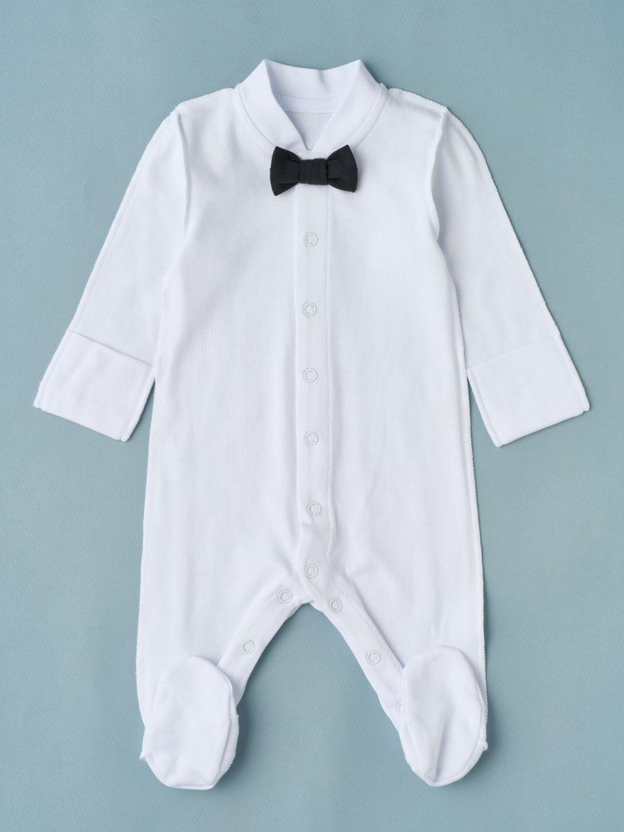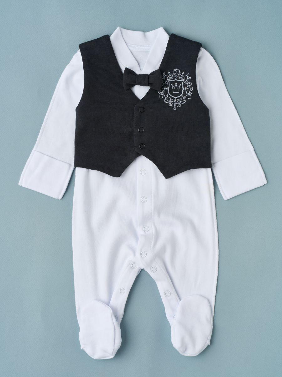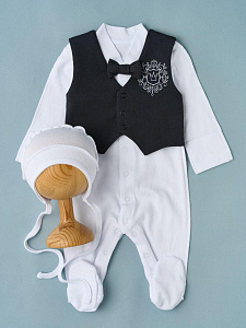 Красивый набор для выписки малыша из роддома. Комбинезон выполнен из 100% хлопка, швами наружу и украшен маленькой вышивкой на комбинезоне и чепчике. Чепчик однослойный с завязками, швами наружу. Комплект смотрится невероятно нежно и станет украшением для Вашей выписки в любое время года.