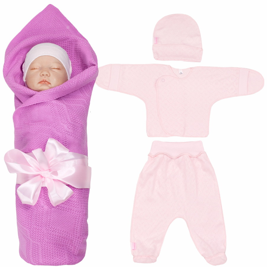 Комплектация: 1. Одеяльце-плед вязаный 90*90см - Акрил 100% 2. Лента-бант 3м 3. Распашонка с ручками 4. Шапочка легкая с отворотом 5. Ползунки на поясе