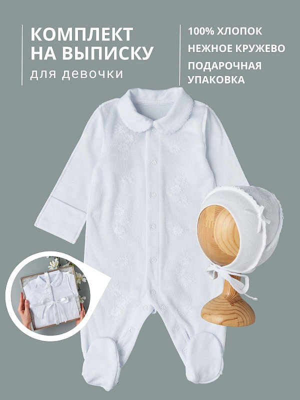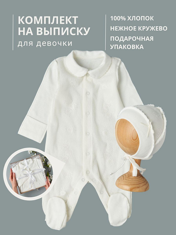 Изысканный комплект для выписки новорожденного, созданный с любовью к самым маленьким. Элегантное сочетание 100% хлопка и кружева делает этот набор идеальным выбором для особенного дня.