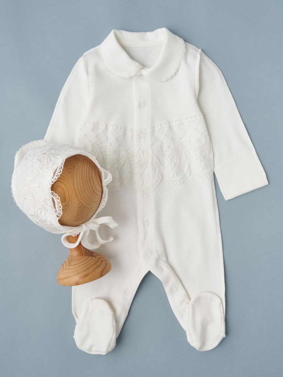 Кружевной набор для выписки малыша из роддома. Комбинезон выполнен из 100% хлопка, швами наружу и украшен кружевом. Чепчик однослойный с завязками, со швами наружу. Комплект смотрится невероятно нежно и станет украшением для Вашей выписки в любое время года. УХОД: рекомендована ручная или машинная стирка с использованием детского порошка, на деликатном режиме, при температуре воды не выше 40 градусов. Не отбеливать. Сушить вдали от обогревательных приборов и прямых солнечных лучей.