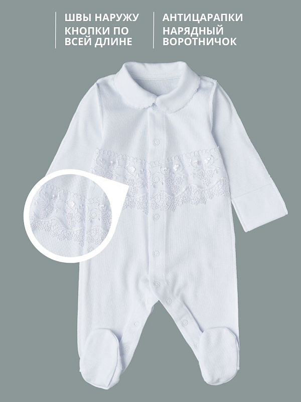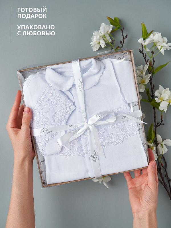 Кружевной набор для выписки малыша из роддома. Комбинезон выполнен из 100% хлопка, швами наружу и украшен кружевом. Чепчик однослойный с завязками, со швами наружу. Комплект смотрится невероятно нежно и станет украшением для Вашей выписки в любое время года. УХОД: рекомендована ручная или машинная стирка с использованием детского порошка, на деликатном режиме, при температуре воды не выше 40 градусов. Не отбеливать. Сушить вдали от обогревательных приборов и прямых солнечных лучей.