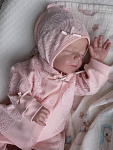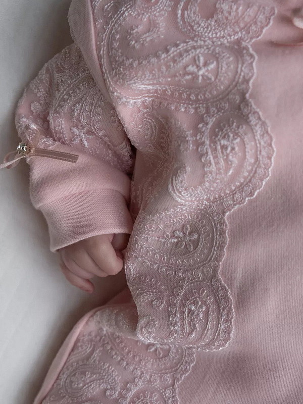 Нежный комплект на выписку представлен в двух цветах: розовом и экрю. Выполнен из хлопка высочайшего качества. Комбинезон застегивается от воротничка до ножек на удобные застежки-кнопки. Комплект украшен нежнейшим кружевом и изящными атласными бантиками со стразами.