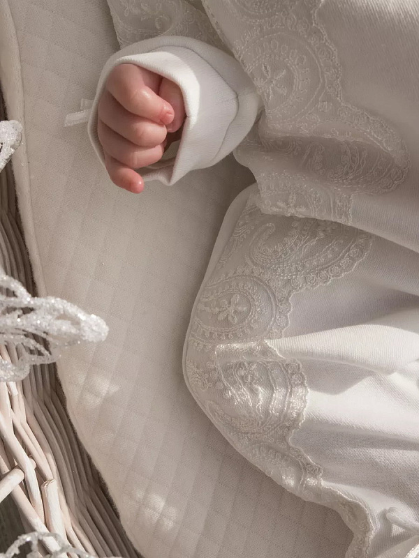 Нежный комплект на выписку представлен в двух цветах: розовом и экрю. Выполнен из хлопка высочайшего качества. Комбинезон застегивается от воротничка до ножек на удобные застежки-кнопки. Комплект украшен нежнейшим кружевом и изящными атласными бантиками со стразами.
