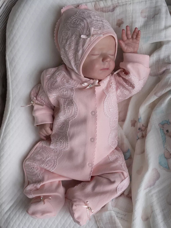 Нежный комплект на выписку представлен в двух цветах: розовом и экрю. Выполнен из хлопка высочайшего качества. Комбинезон застегивается от воротничка до ножек на удобные застежки-кнопки. Комплект украшен нежнейшим кружевом и изящными атласными бантиками со стразами.