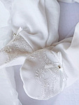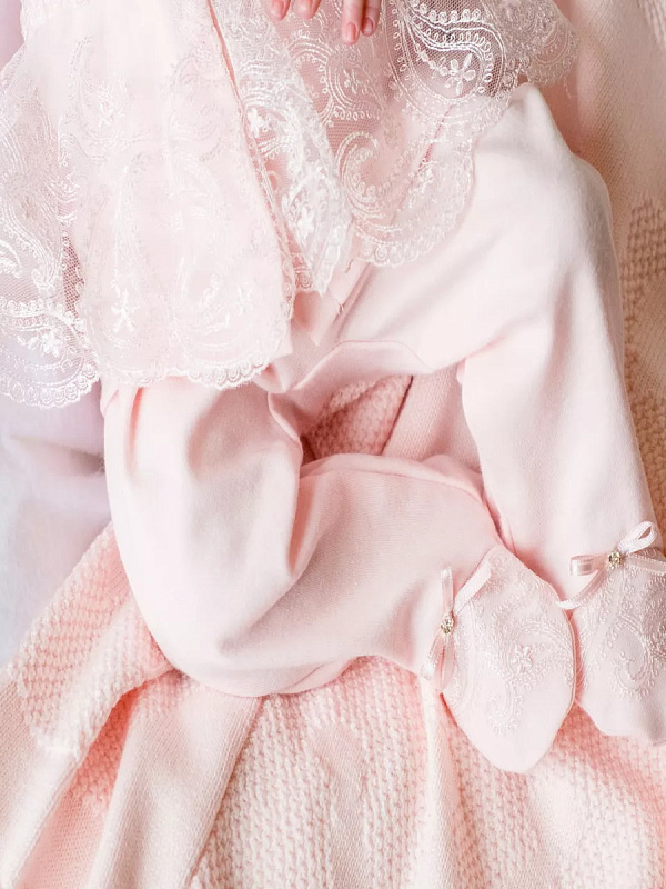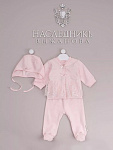 Комплект на выписку представлен в двух расцветках нежно-розовом и экрю. Он выполнен из хлопка высочайшего качества. В комплект входит изящная кофточка, ползунки на высокой резинке, чепчик-шлем. Комплект украшен нежнейшим кружевом и изящными атласными бантиками со стразами.
