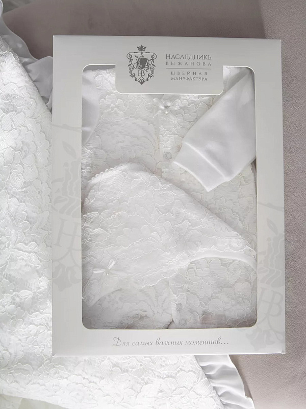 Комплект на выписку НаследникЪ Выжанова для девочки выполнен из 100% хлопка. Состоит из двух предметов: чепчика на завязках и комбинезона. Комбинезон застегтвается на кнопки, ножки закрыты. Комплект на выписку выглядит очень торжественно благодаря кружевной вставке. Малышка будет выглядеть как маленькая принцесса как в торжественный день выписки из роддома, так и в обычные будние дни. Материал хорошо пропускает воздух и гипоалергенен.