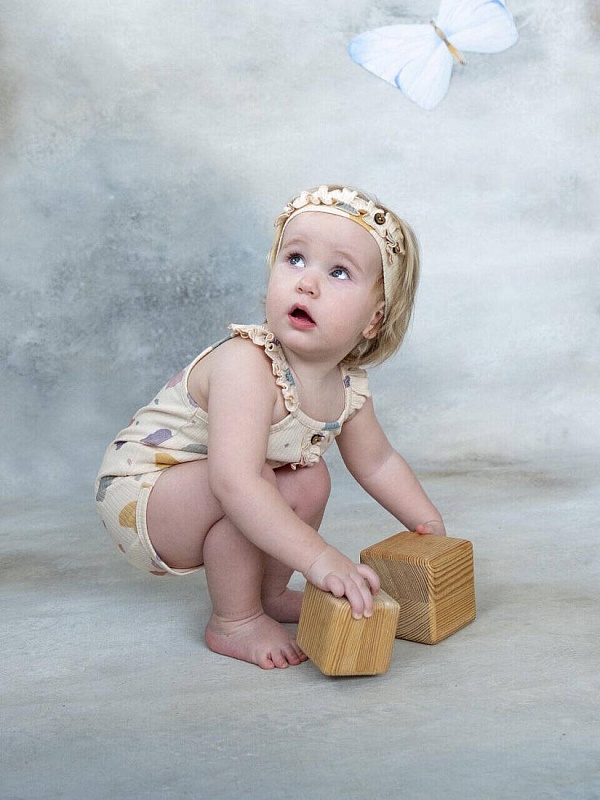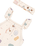 Летний комплект для девочки состоит их песочника и повязки на голову. Модель не имеет застежек, что позволит быстро снять и одеть песочник.