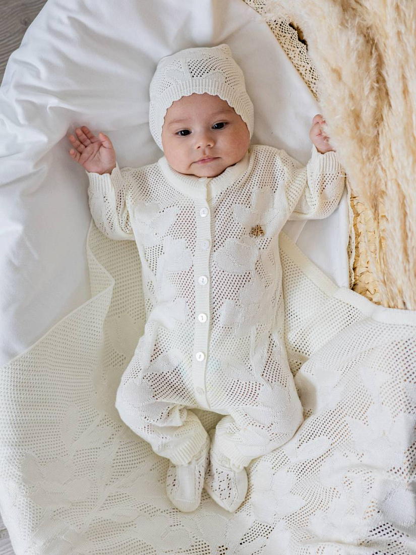 Комплект для малышей включает комбинезон и шапка, выполненные из 100% хлопок. Визуально изделие отличается нежным оттенком и ажурной текстурой с выразительным узором в виде крупных цветочных мотивов, напоминающих цветущие сады. Комбинезон имеет длинные рукава и ножки, застегивается по центру на удобные кнопки, что облегчает переодевание. Эластичные манжеты на рукавах и ножках обеспечивают комфортную посадку и удерживают тепло. Шапка выполнена в едином стиле с комбинезоном, украшена тем же ажурным цветочным узором и оснащена мягкими завязками, которые надежно фиксируют изделие на голове ребенка. Оба элемента комплекта имеют аккуратные края с волнистой отделкой, что придает изделию дополнительную декоративность. Материал – натуральный хлопок, который отличается мягкостью, гипоаллергенностью и позволяет коже малыша свободно дышать, обеспечивая комфорт в течение всего дня.