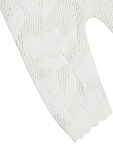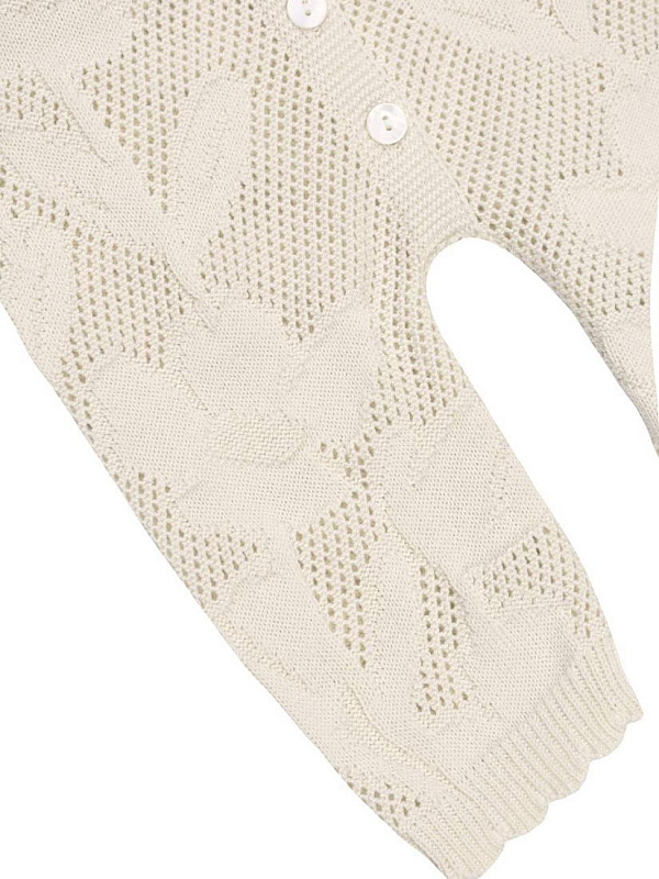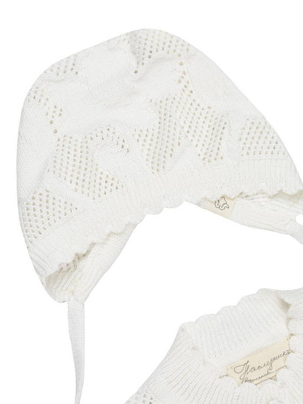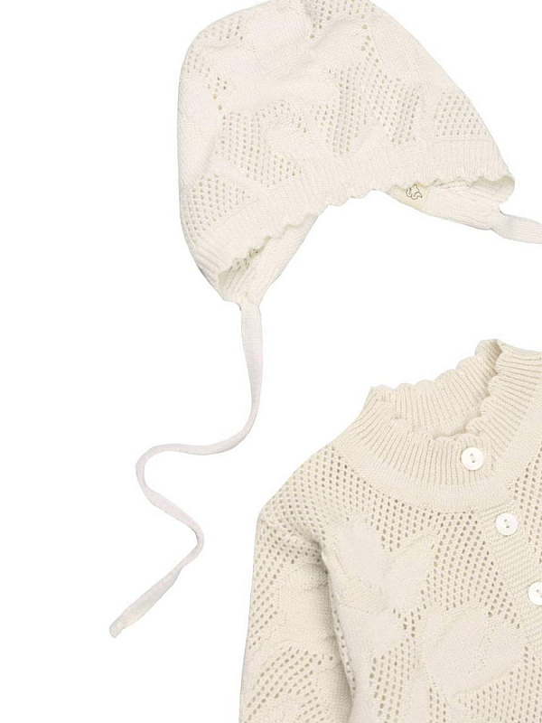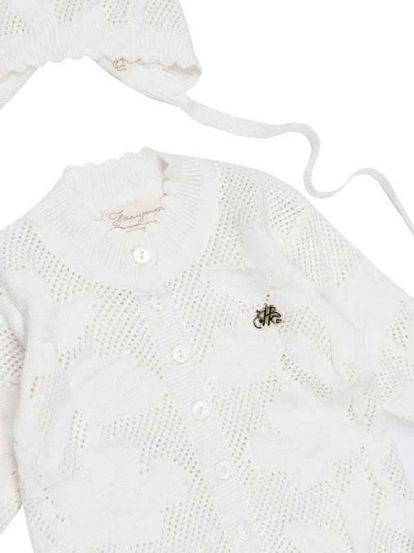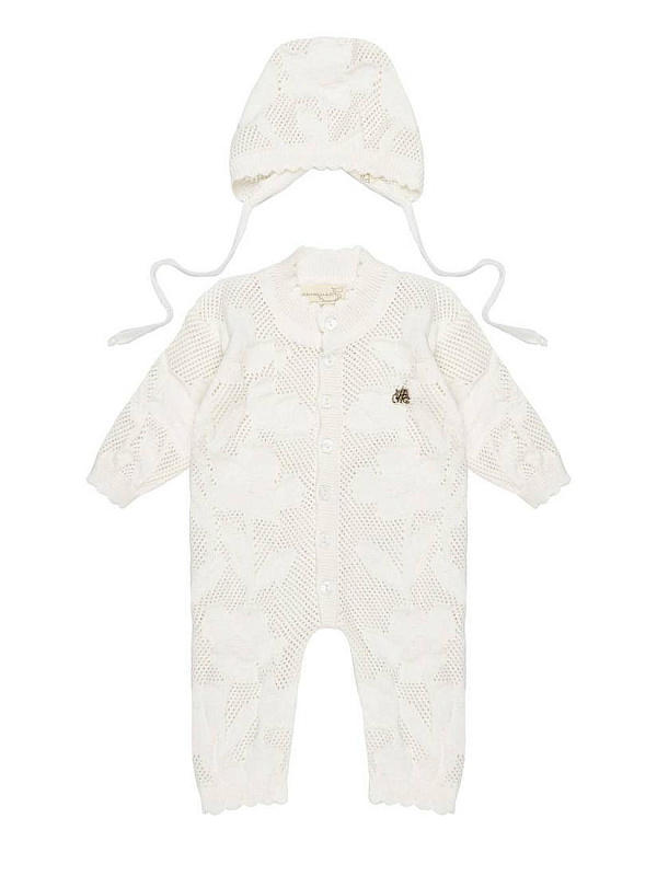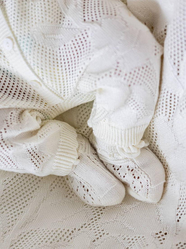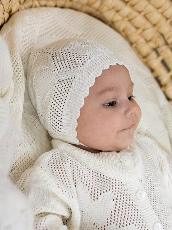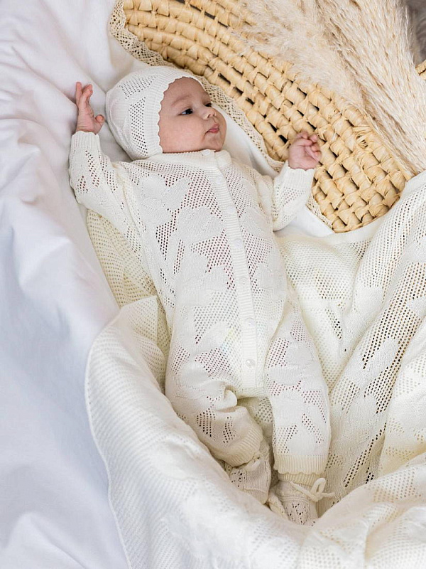 Комплект для малышей включает комбинезон и шапка, выполненные из 100% хлопок. Визуально изделие отличается нежным оттенком и ажурной текстурой с выразительным узором в виде крупных цветочных мотивов, напоминающих цветущие сады. Комбинезон имеет длинные рукава и ножки, застегивается по центру на удобные кнопки, что облегчает переодевание. Эластичные манжеты на рукавах и ножках обеспечивают комфортную посадку и удерживают тепло. Шапка выполнена в едином стиле с комбинезоном, украшена тем же ажурным цветочным узором и оснащена мягкими завязками, которые надежно фиксируют изделие на голове ребенка. Оба элемента комплекта имеют аккуратные края с волнистой отделкой, что придает изделию дополнительную декоративность. Материал – натуральный хлопок, который отличается мягкостью, гипоаллергенностью и позволяет коже малыша свободно дышать, обеспечивая комфорт в течение всего дня.