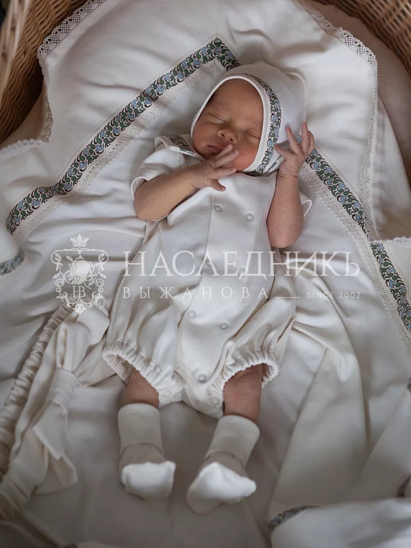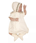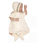 Комплект не только на крещение малыша, но и торжественную выписку из роддома, а также для летних пронулок. Натуральный органический хлопок создает атмосферу комфорта , а дизайнерское решение в отделке, делают комплект уникальным стильным современным. Комплект для мальчика: комбинезон (песочник), чепчик, пинетки.