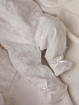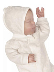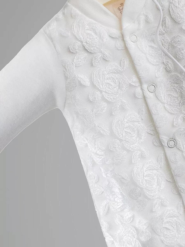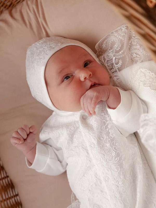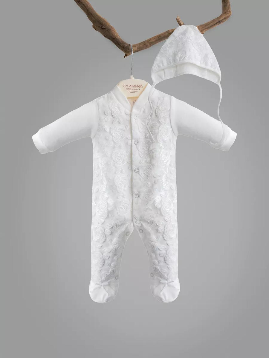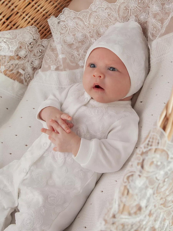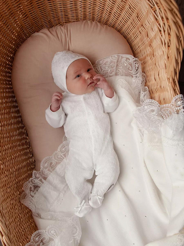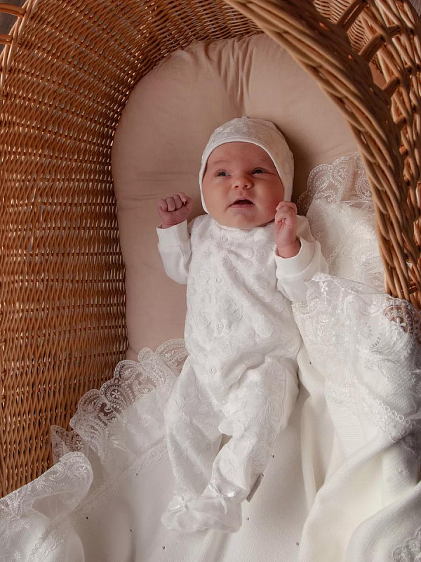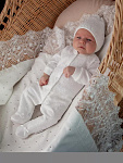 Отделка выполнена из нежнейшего кружева. Состав комплекта: комбинезон на кнопках, чепчик, фирменная коробка.