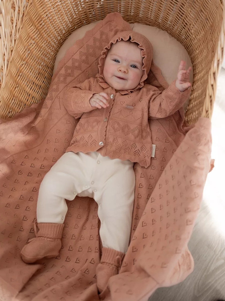 Комплект одежды НаследникЪ Выжанова состоит из кофточки, шапочки и пинеток. Модель выполнена из вязаного трикотажа. Натуральный хлопок подходит детям даже с чувствительной кожей, он очень нежный, мягкий, приятный на ощупь. Модель свободного силуэта с застежкой на пуговицы спереди, легко и быстро одевается и снимается. Материал хорошо пропускает воздух.