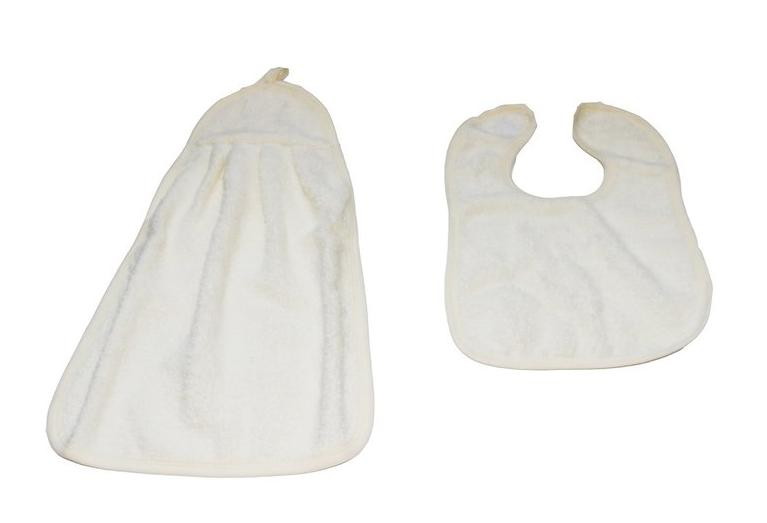- Набор состоит из двух частей - нагрудника и большого полотенчика для вытирания рук и лица.