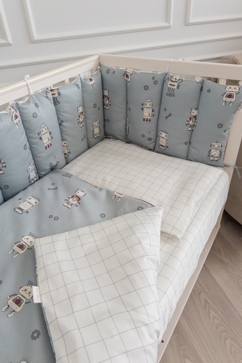 Комплект постельного белья Lappetti "РобоМалыши" из трех предметов – это настоящее произведение искусства, созданное для того, чтобы преобразить детскую кроватку в уютное и волшебное пространство. Вдохновленный миром милых роботов, этот комплект призван дарить вашему малышу не только комфорт, но и незабываемые моменты радости и игры. Каждый элемент коллекции пропитан заботой и вниманием к мелочам, что делает его идеальным выбором для самых требовательных родителей.