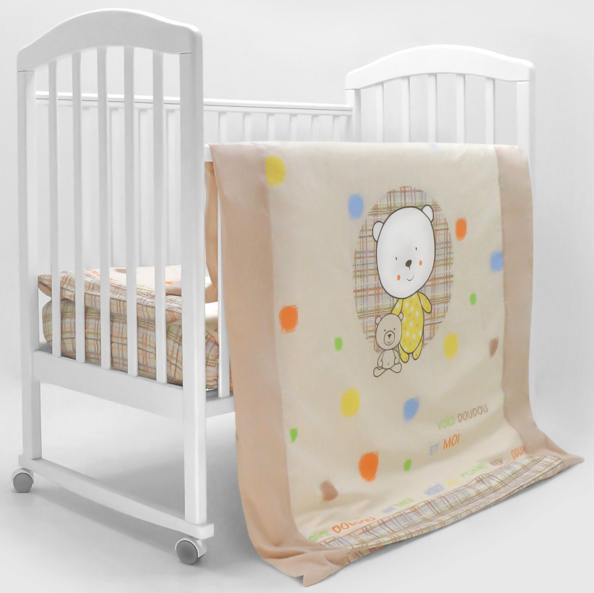 Симпатичный медвежонок, украшающий нежный комплект, поможет сладко уснуть вашему крохе