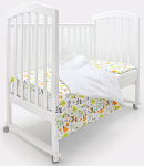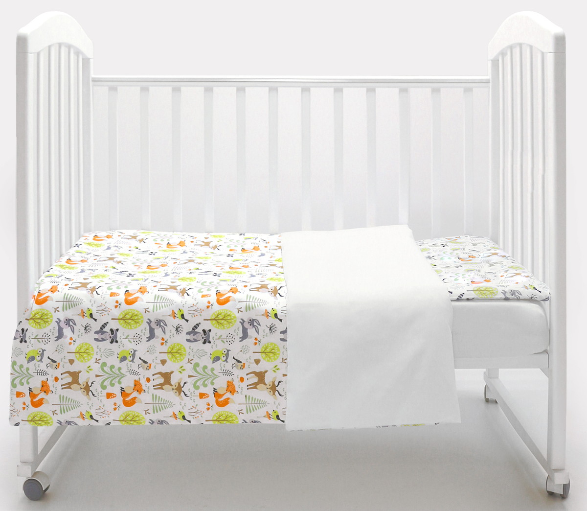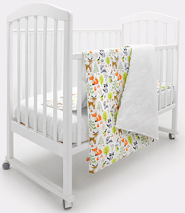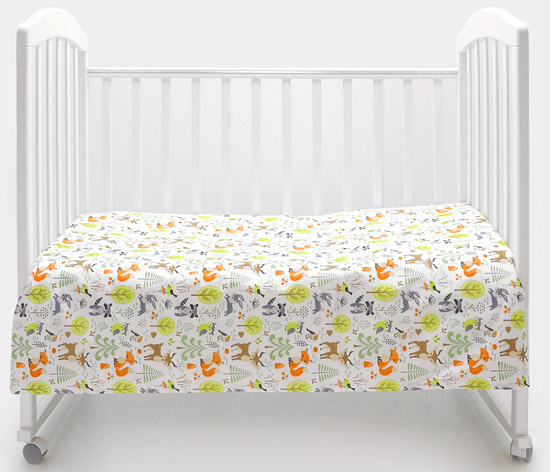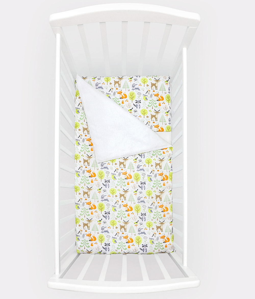 дизайнерский принт в виде зверят, птичек и растений украшает наволочку и лицевую сторону пододеяльника