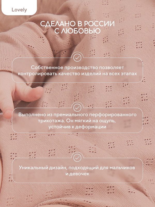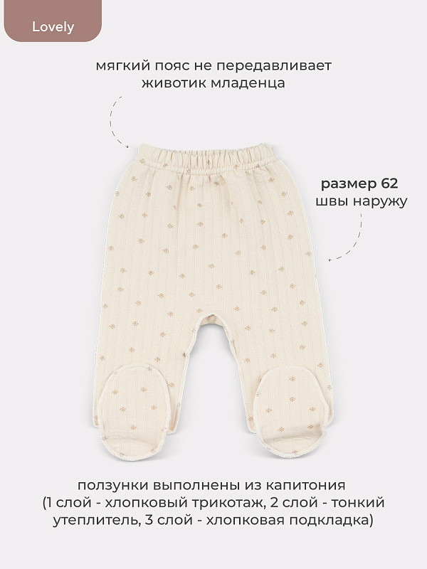 Коллекция LOVELY подарит крохе ощущение нежности и особой заботы. Мягкие сдержанные расцветки (молоко, какао, топленое масло), деликатные натуральные ткани премиум-класса (перфорированный трикотаж и утепленный капитоний), качественная фурнитура в тон, комфортное лекало, лаконичное исполнение, сочетающиеся между собой изделия - визитная карточка нашей одежды для новорожденных и малышей постарше.