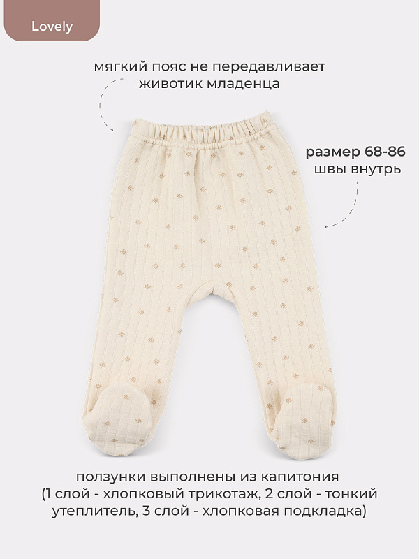 Коллекция LOVELY подарит крохе ощущение нежности и особой заботы. Мягкие сдержанные расцветки (молоко, какао, топленое масло), деликатные натуральные ткани премиум-класса (перфорированный трикотаж и утепленный капитоний), качественная фурнитура в тон, комфортное лекало, лаконичное исполнение, сочетающиеся между собой изделия - визитная карточка нашей одежды для новорожденных и малышей постарше.