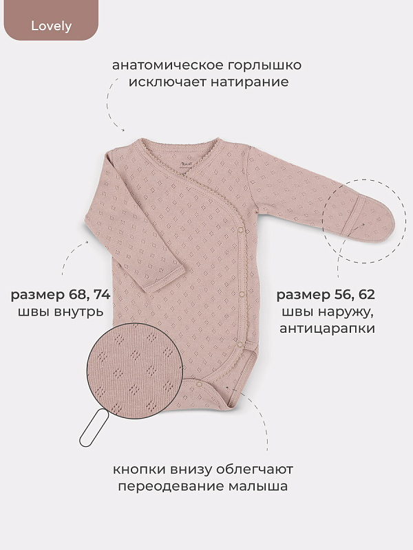Коллекция LOVELY подарит крохе ощущение нежности и особой заботы. Мягкие сдержанные расцветки (молоко, какао, топленое масло), деликатные натуральные ткани премиум-класса (перфорированный трикотаж и утепленный капитоний), качественная фурнитура в тон, комфортное лекало, лаконичное исполнение, сочетающиеся между собой изделия - визитная карточка нашей одежды для новорожденных и малышей постарше.