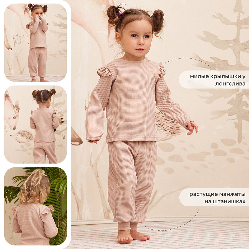 Трогательный комплект для прогулок, путешествий и запоминающихся фотосессий. Штанишки дополнены мягким поясом и широкими трикотажными манжетами. Застежка-поло на 3 пуговицы сделает процесс переодевания лонгслива максимально комфортным, а для маленьких модниц предлагается модель с очаровательными крылышками. В подарок стильная шапочка. Аксессуар не только отлично защитит ушки от ветра, но завершит модный аутфит.