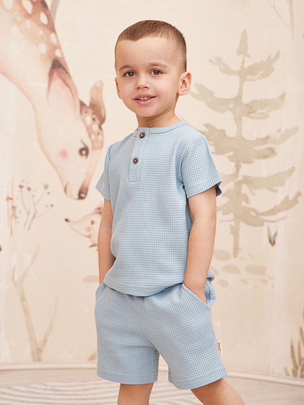 Трогательный комплект для прогулок, путешествий и запоминающихся фотосессий. Шорты дополнены мягким поясом и карманами для важных находок во время прогулки. Застежка-поло на 2 пуговицы сделает процесс переодевания футболки максимально комфортным.
