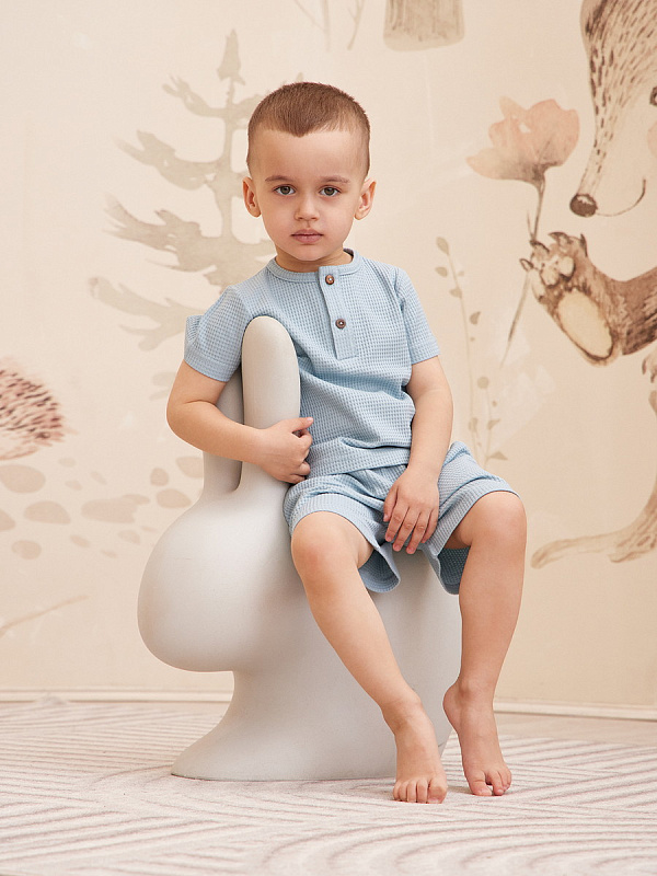 Трогательный комплект для прогулок, путешествий и запоминающихся фотосессий. Шорты дополнены мягким поясом и карманами для важных находок во время прогулки. Застежка-поло на 2 пуговицы сделает процесс переодевания футболки максимально комфортным.
