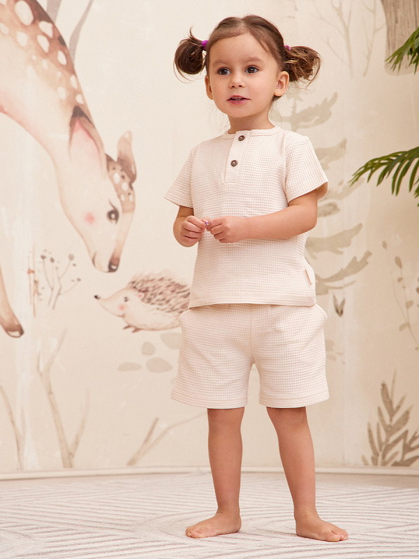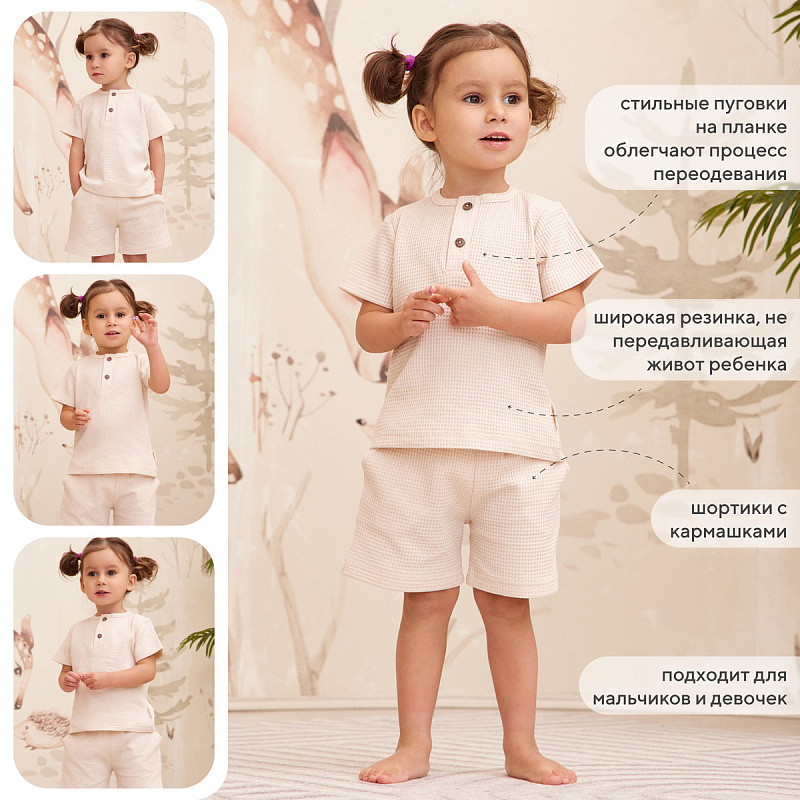 Трогательный комплект для прогулок, путешествий и запоминающихся фотосессий. Шорты дополнены мягким поясом и карманами для важных находок во время прогулки. Застежка-поло на 2 пуговицы сделает процесс переодевания футболки максимально комфортным.