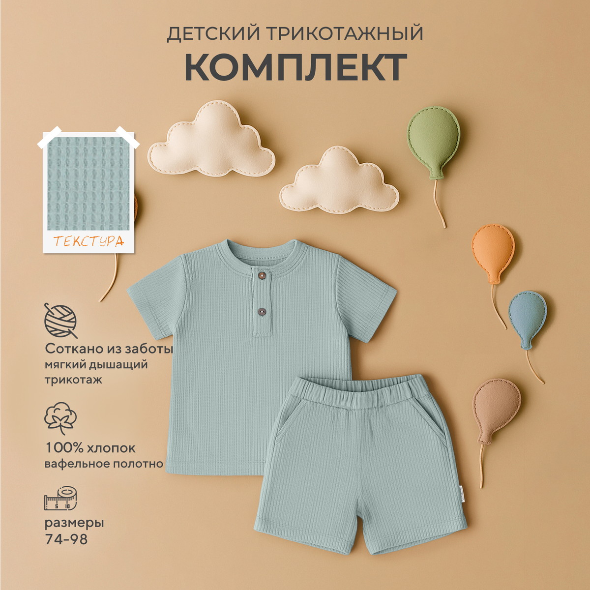 Каждый образ, созданный с помощью коллекции, хочется потрогать взглядом. И неудивительно, ведь особая магия моделей WAFFY это: деликатные спокойные расцветки (мятный, небесно-голубой, кофе с молоком, миндальный, крем-брюле), натуральные премиальные ткани (фактурный вафельный трикотаж - тактильно приятный материал, прекрасно впитывающий влагу, но пропускающий воздух), качественная фурнитура, комфортное лекало, лаконичное исполнение, сочетающиеся между собой изделия.