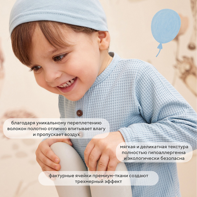 Эксклюзивная коллекция WAFFY буквально соткана из заботы и наполнена бесконечной любовью к нашим маленьким клиентам. Деликатные спокойные расцветки, натуральные ткани премиум-класса (фактурный вафельный трикотаж), качественная фурнитура, комфортное лекало, лаконичное исполнение, сочетающиеся между собой изделия - визитная карточка нашей одежды для малышей.