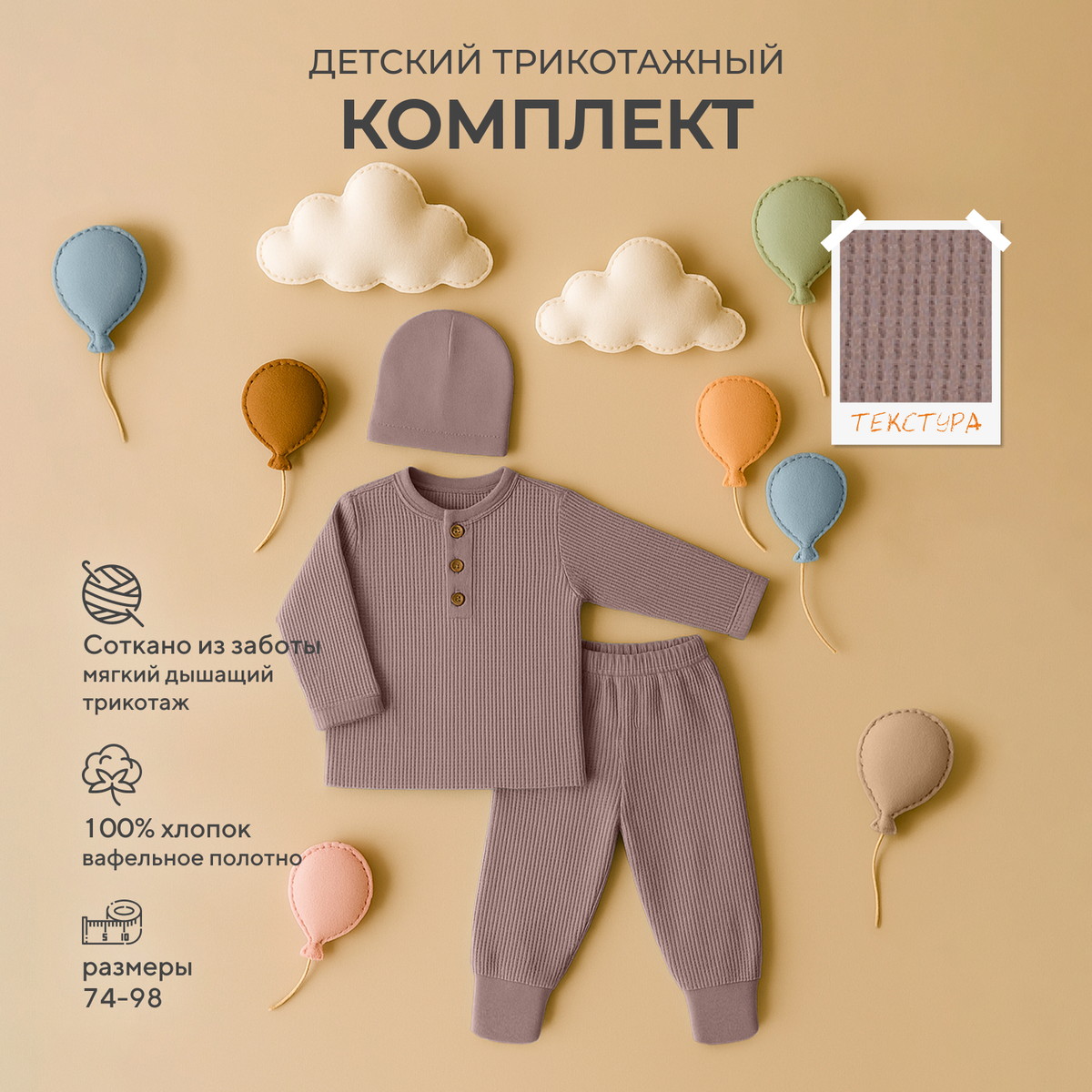 Эксклюзивная коллекция WAFFY буквально соткана из заботы и наполнена бесконечной любовью к нашим маленьким клиентам. Деликатные спокойные расцветки, натуральные ткани премиум-класса (фактурный вафельный трикотаж), качественная фурнитура, комфортное лекало, лаконичное исполнение, сочетающиеся между собой изделия - визитная карточка нашей одежды для малышей.