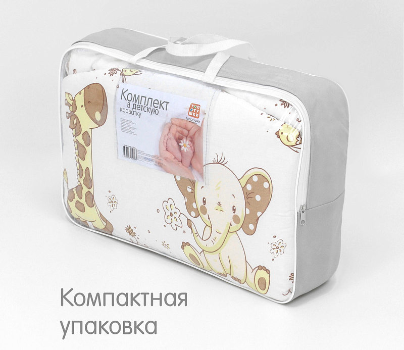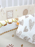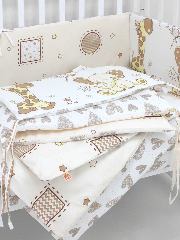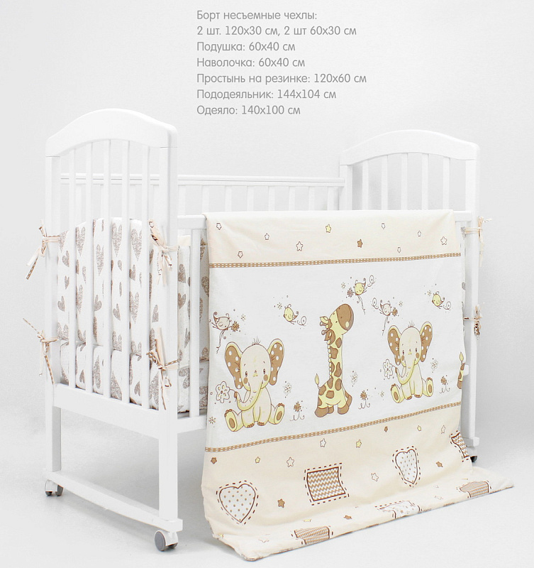 - роскошный комплект с дизайнерскими принтами в виде забавных зверят - слоника и жирафа - обязательно понравится вашему малышу. Обратите внимание на тыльную сторону пододеяльника и бортиков, которые обладают принтом в виде сердечек