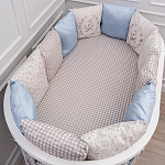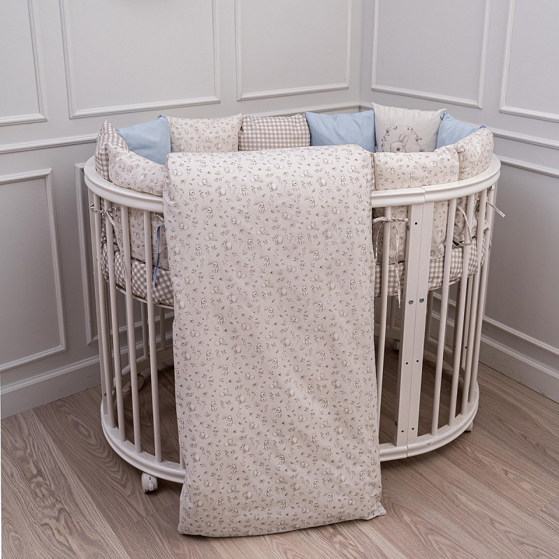 Комплект детского постельного белья Lappetti «Кролик Лаппин» предназначен для кроватки овальной и круглой формы. Он состоит из 6 предметов – подушки, одеяла, наволочки, пододеяльника, простыни без резинки и бампера из 12 подушек со съемными чехлами. Для изготовления постельных принадлежностей использовался высококачественный поплин. Это 100% натуральный материал, обеспечивающий приятные тактильные ощущения, а также отличающийся высокими гигроскопичными и гигиеническими свойствами. В качестве наполнителя подушки используется холлкон и бамбуковое волокно, которые представляющие собой антиаллергенные материалы.