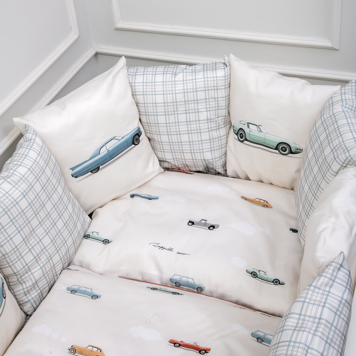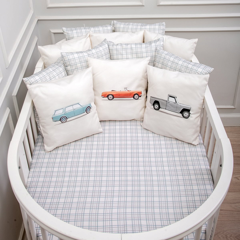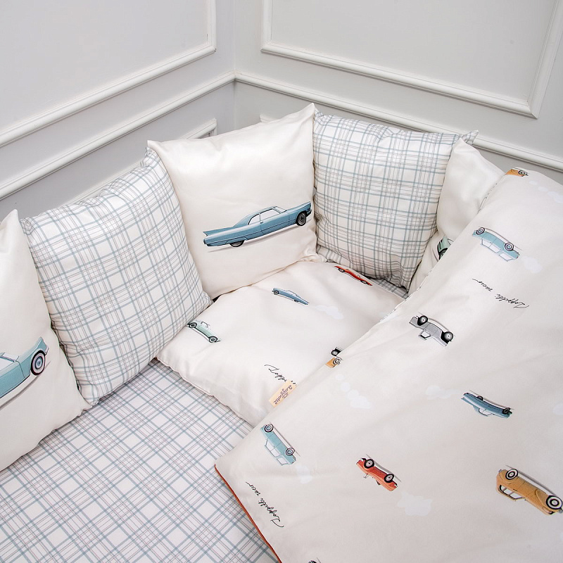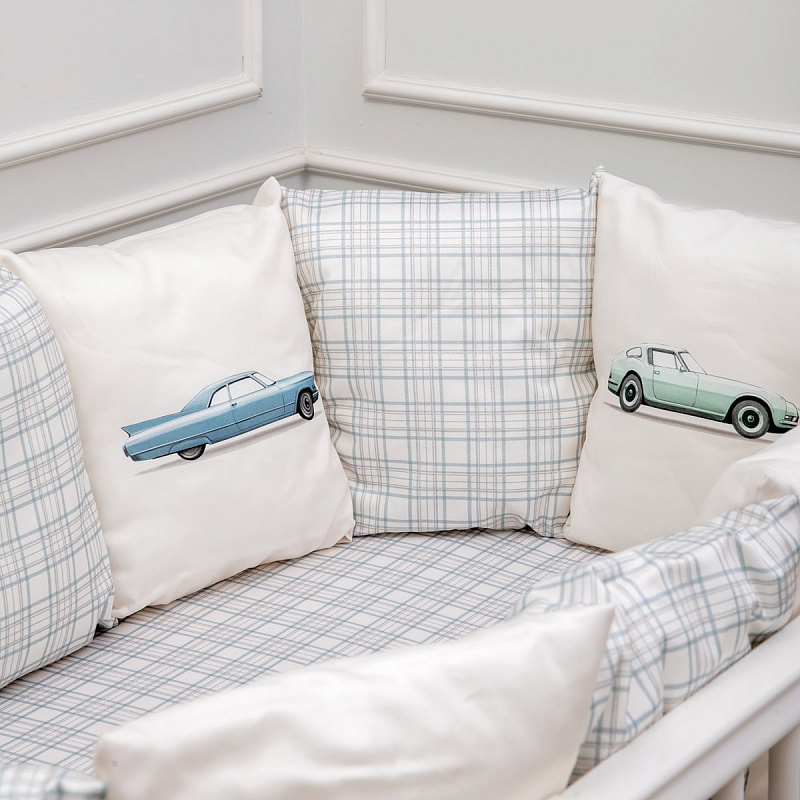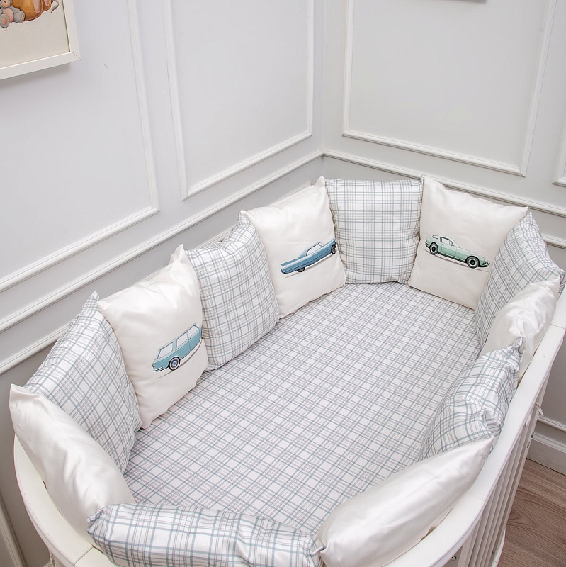 Бортик, состоящий из 12 мягких подушек (30*30) со съемными чехлами, станет надежной защитой и украшением кроватки.