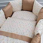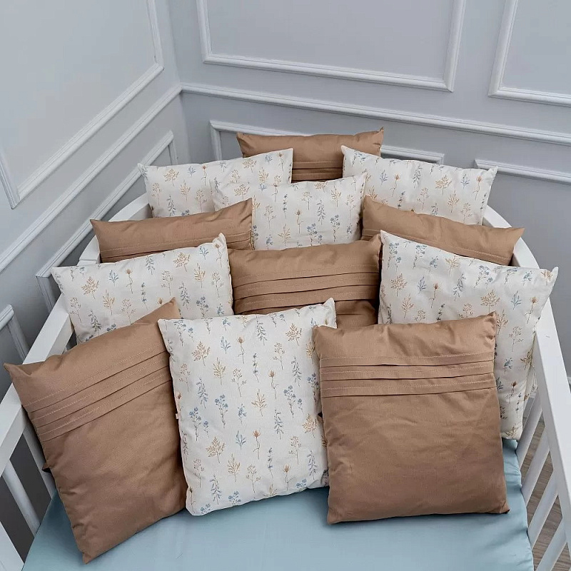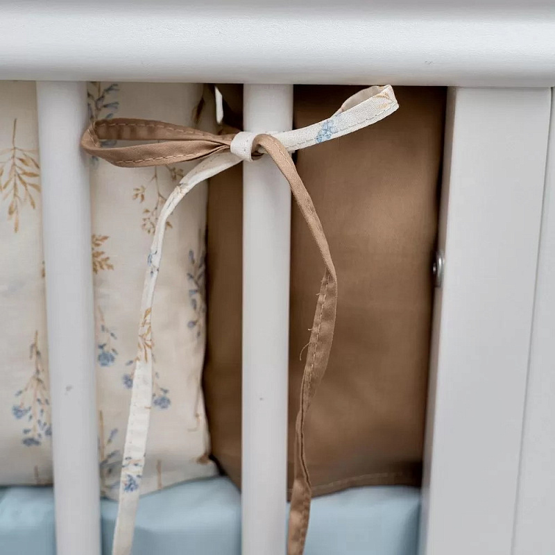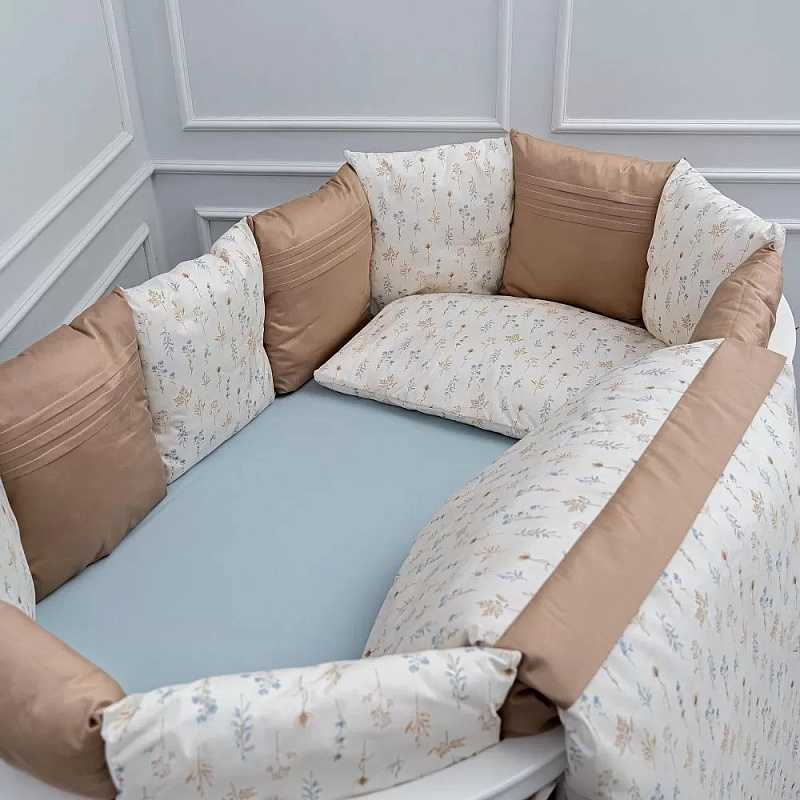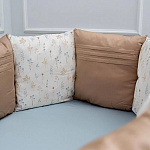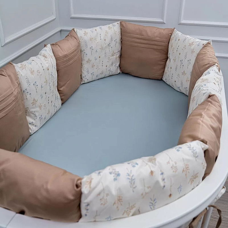 Комплект подойдет в детскую кроватку любой формы. Мягкие подушки предотвратят просовывание ног и рук между рейками кровати. Выполнен из гипоалергенных материалов. Перед исользованием рекомендована стирка.