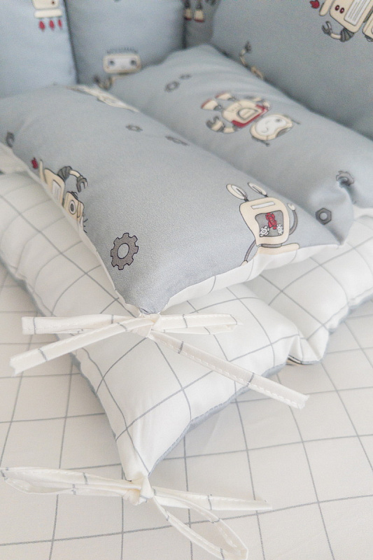 Основу комплекта составляют стеганые двухсторонние бортики размером 360х44 см, состоящие из четырех частей. Изготовленные из 100% хлопка (сатин) и наполненные гипоаллергенным холлоконом, они не только создают уютное гнездышко, но и служат надежной защитой от случайных столкновений с бортиками кроватки. Оригинальный дизайн с любимыми малышами роботами добавит элемент игры и фантазии в детскую комнату.