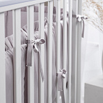 Все элементы бортиков крепятся к кроватке при помощи прочно пришитых завязок. На концах завязок стоят закрепляющие швы, благодаря чему они не разойдутся и прослужат долго. Кроме того, завязки добавляют бортикам нежного изящества.