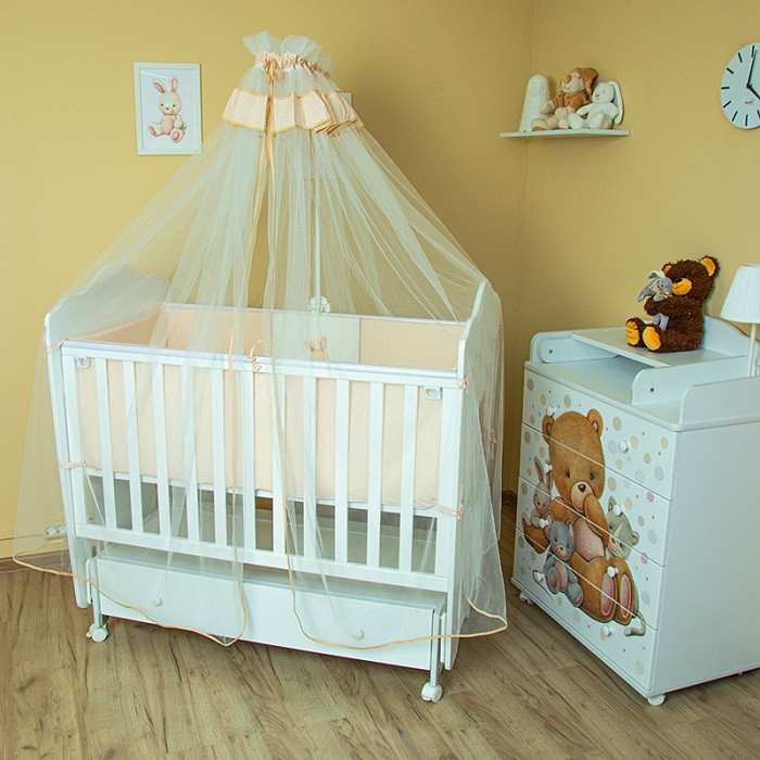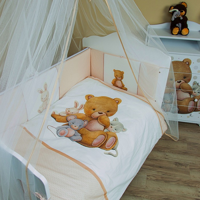 Комплект в кровать Vikalex Мишкина Компания горох 6 предметов - представляет собой набор детского постельного белья, который состоит из 6-ти предметов. Данная модель выполнена в оттенках бежевого цвета , рисунком которой служит «Мишкина компания» с гороховым принтом. Постельный набор отлично впишется в кроватку для вашего малыша и украсит ваш интерьер, поскольку выполнен в тёплых оттенках, а мягкая и приятная к телу ткань подарит вашему младенцу спокойный и здоровый сон. Наше постельное бельё создано для того, чтобы обеспечить максимальным комфортом и уютом новорождённых.