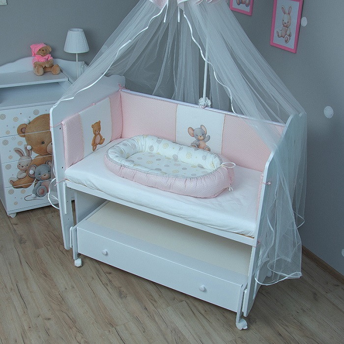 В комплектеПростыня на резинке, Подушка, Одеяло, Наволочка, Пододеяльник, Бортик (бампер)
