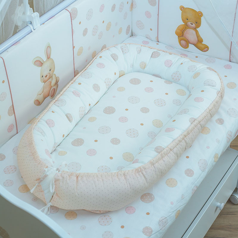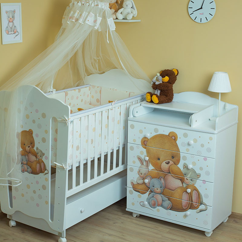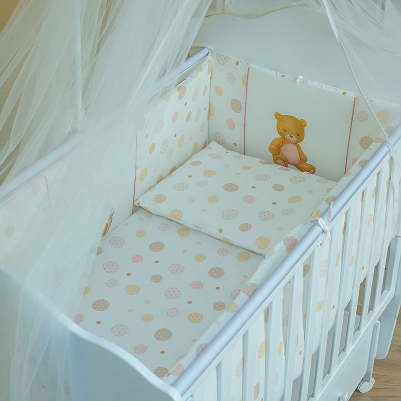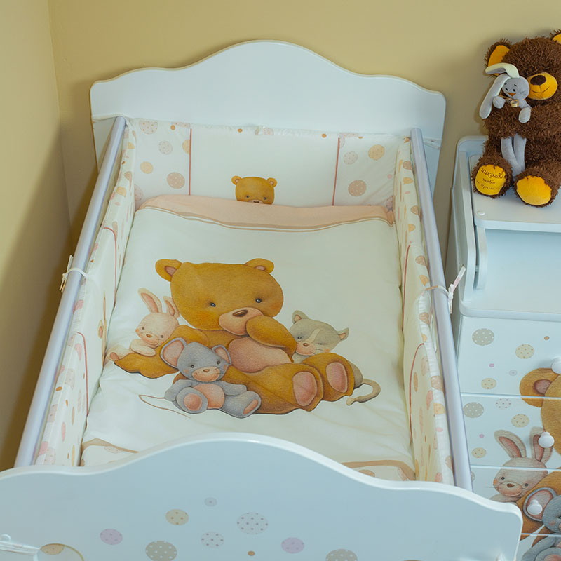 Комплект в кровать Vikalex Мишкина Компания пузырьки 6 предметов - представляет собой набор детского постельного белья, который состоит из 6-ти предметов. Данная модель выполнена в оттенках бежевого цвета, рисунком которой служит «Мишкина компания» с небольшими пузырьками. Постельный набор отлично впишется в кроватку для вашего малыша и украсит ваш интерьер, поскольку выполнен в теплых оттенках, а мягкая и приятная к телу ткань подарит вашему младенцу спокойный и здоровый сон. Наше постельное бельё создано для того, чтобы обеспечить максимальным комфортом и уютом новорождённых.