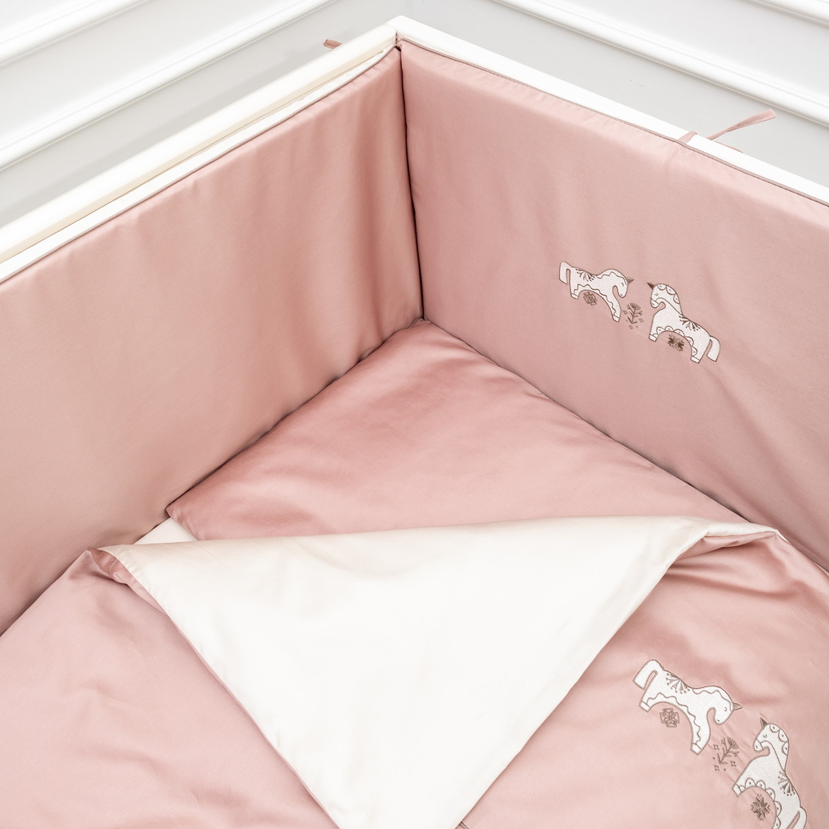 В комплектеПростыня на резинке, Подушка, Одеяло, Наволочка, Пододеяльник, Бортик (бампер)