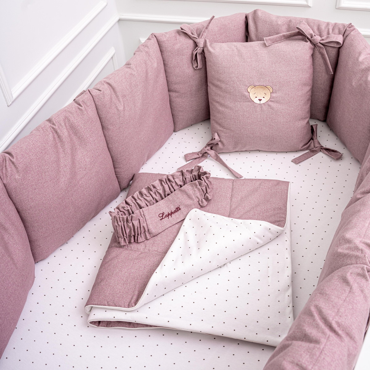 Украшение: Подушечка-бортик украшена декоративной аппликацией "Мишка".