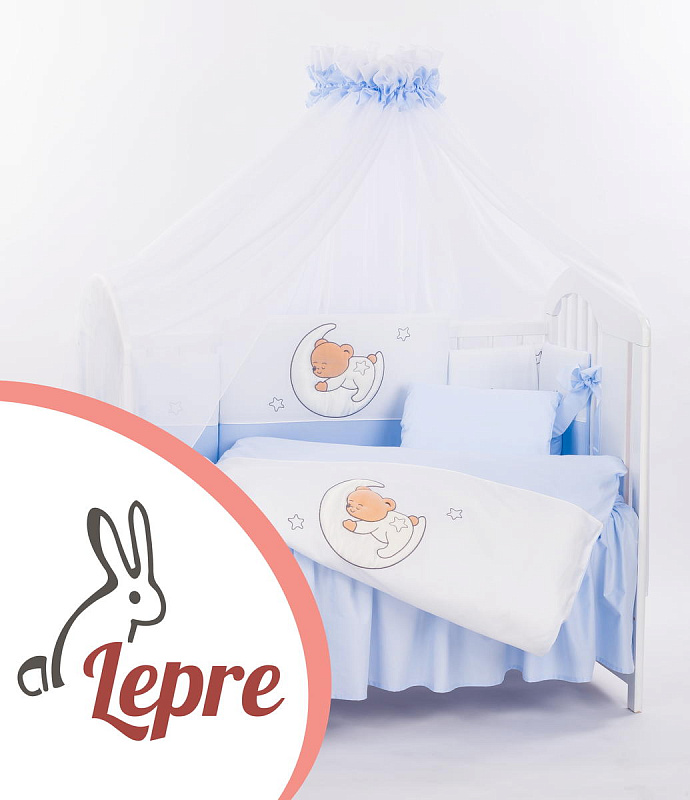 Lepre комплект в кроватку из 6 предметов – это экологически чистое постельное белье для новорожденных, произведенное из 100%-го длинноворсового хлопка, обработанного с учётом жестких европейский норм в Польше. Изготовлен по стандартам CONFIDENCE IN TEXTILES, имеет европейский сертификат.