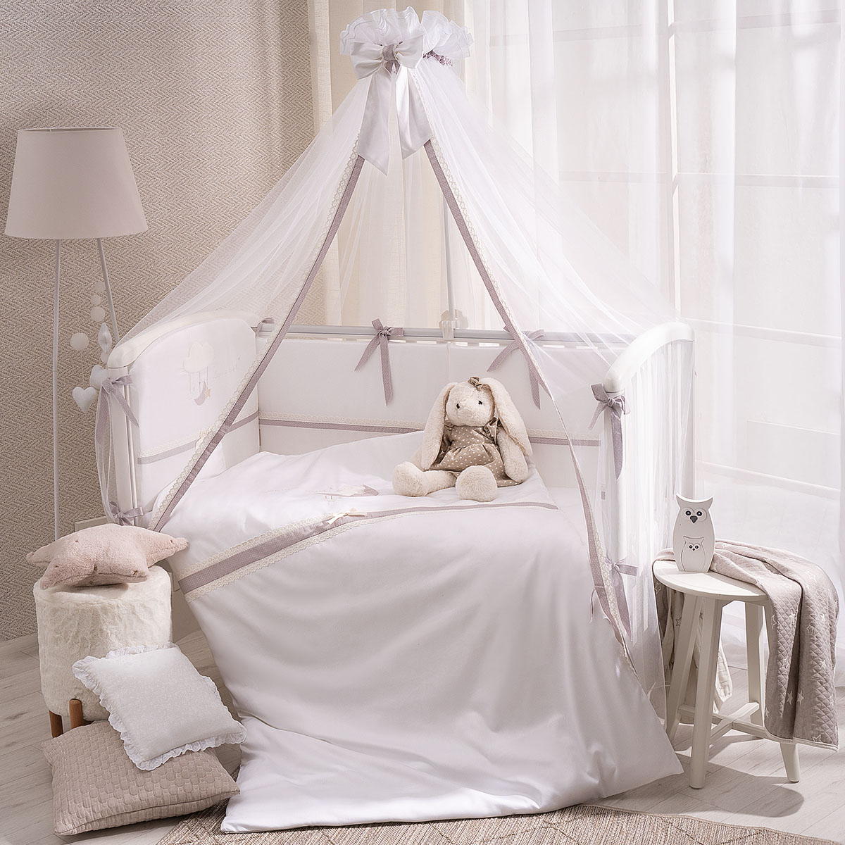 В комплектеПростыня на резинке, Подушка, Одеяло, Наволочка, Пододеяльник, Бортик (бампер)