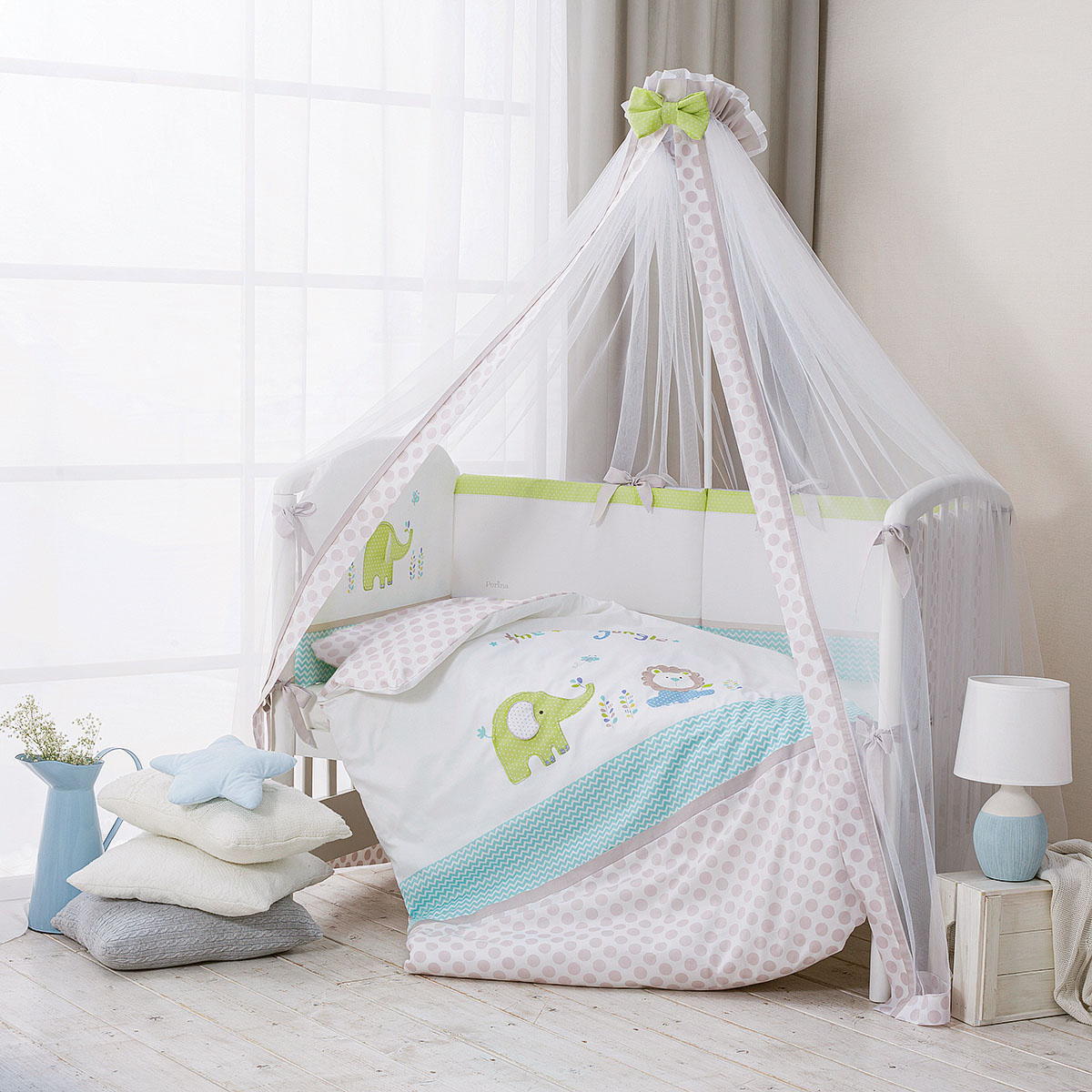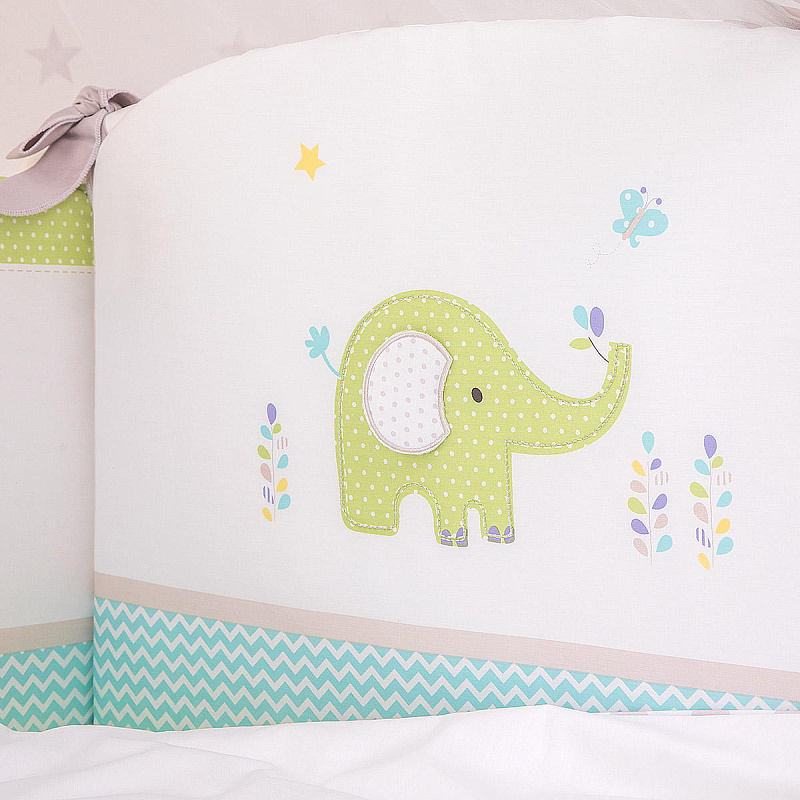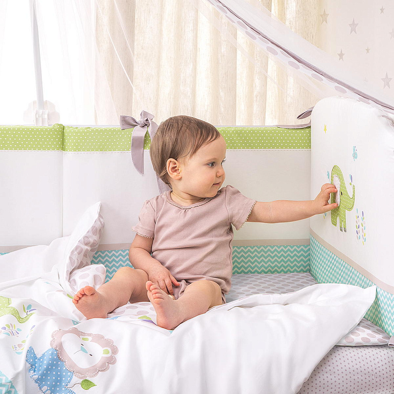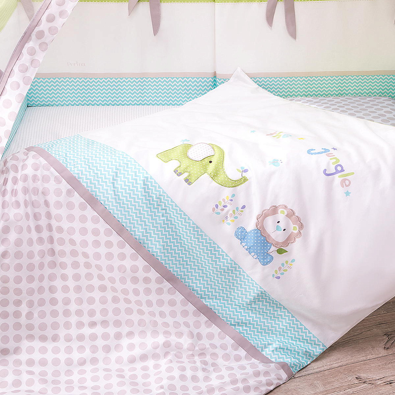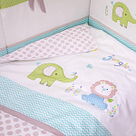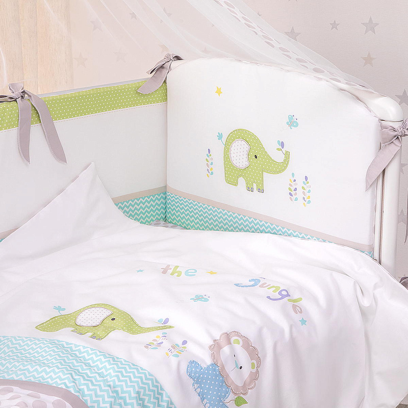 С комплектом «Джунгли» у вашего малыша появятся новые надежные друзья – занимательные красочные зверята. Фактурная вышивка и объемные детали станут первыми детскими открытиями, а нежность элитного сатина убаюкает перед сном и подарит приятные ощущения от каждого прикосновения.