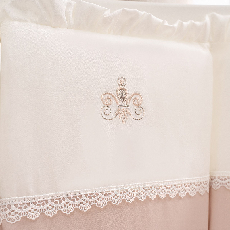 Комплект в кроватку Perina Эстель Oval 7 предметов погружает в атмосферу эпохи Ренессанса. Пастельные тона, воздушное кружево, изящная вышивка и атласные ленты – каждая деталь создает настроение легкости. Комплект продуман до мелочей: специальная форма подушки и одеяло с закругленными углами создают цельную композицию. Составной бампер допускает различные варианты сочетания и подойдет как для круглой, так и для овальной кровати, а функциональность дополнительного кармана уже оценили многие родители.