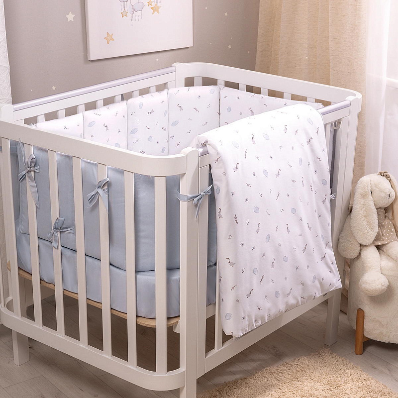 Комплект включает 6 предметов: пододеяльник на молнии, наволочку, простыню на резинке, одеяло, подушку и защитные бортики.