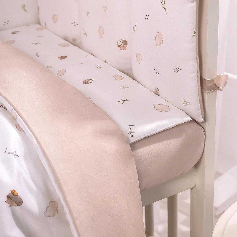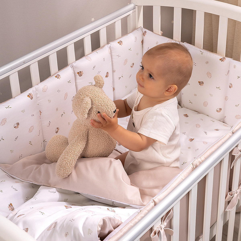 Комплект включает 6 предметов: пододеяльник на молнии, наволочку, простыню на резинке, одеяло, подушку и защитные бортики.