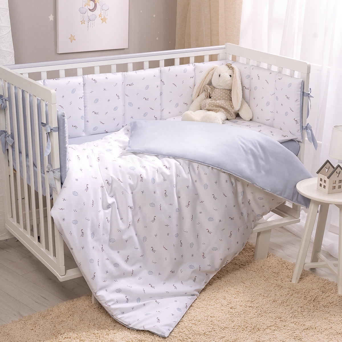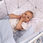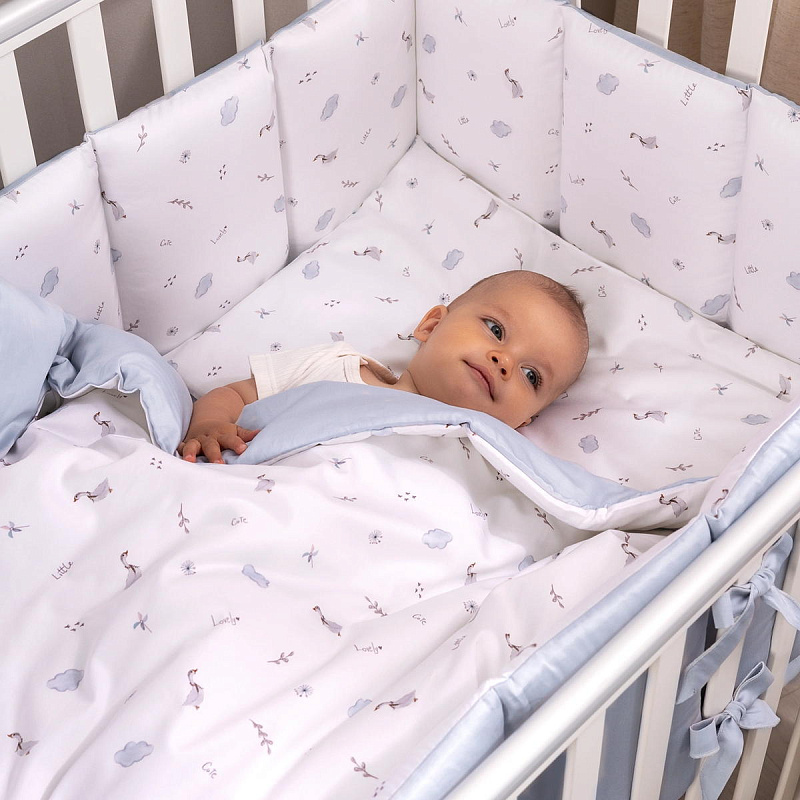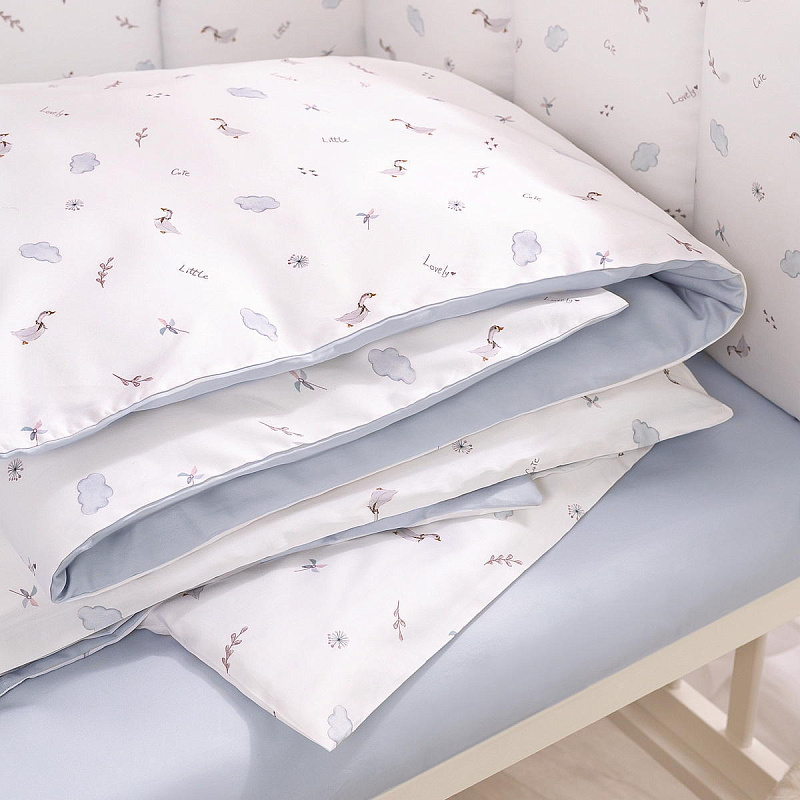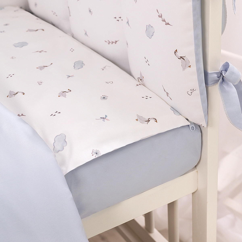 Комплект включает 6 предметов: пододеяльник на молнии, наволочку, простыню на резинке, одеяло, подушку и защитные бортики.
