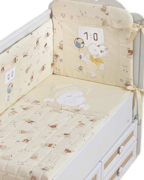 В набореодеяло: 110х140 см; подушка: 40х60 см; наволочка: 40х60; простынка: 60х120 см; бампер: 360х40 см; балдахин:500х170