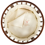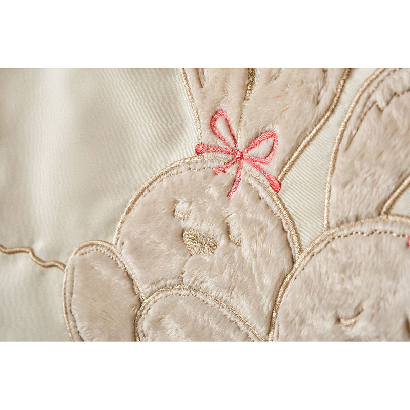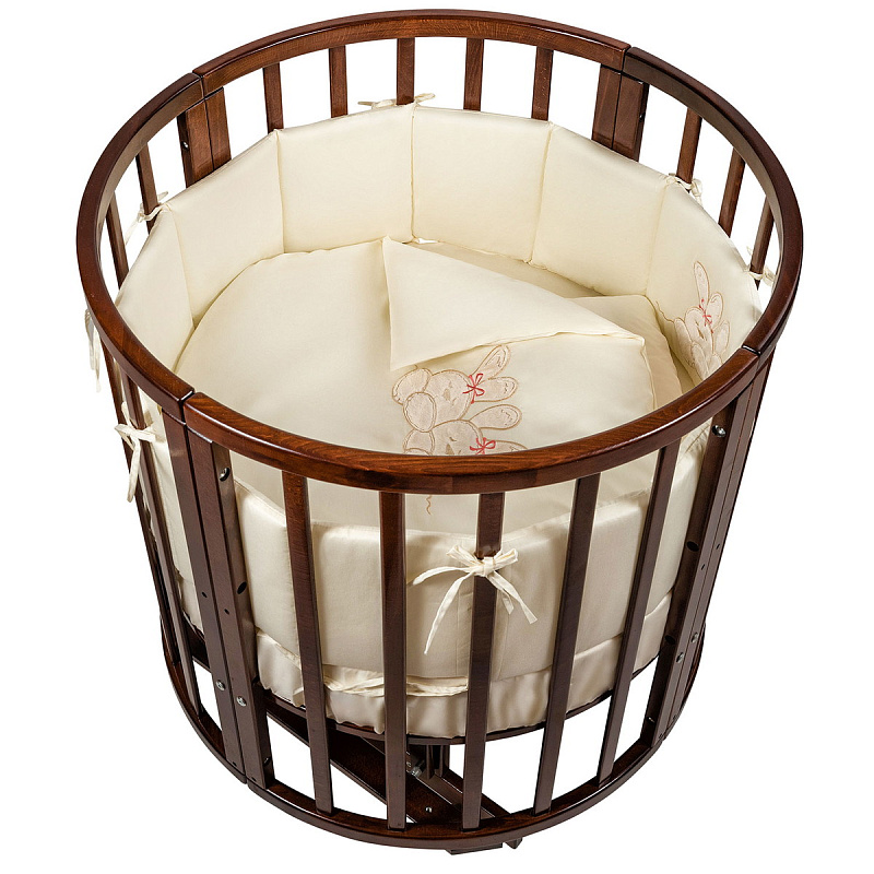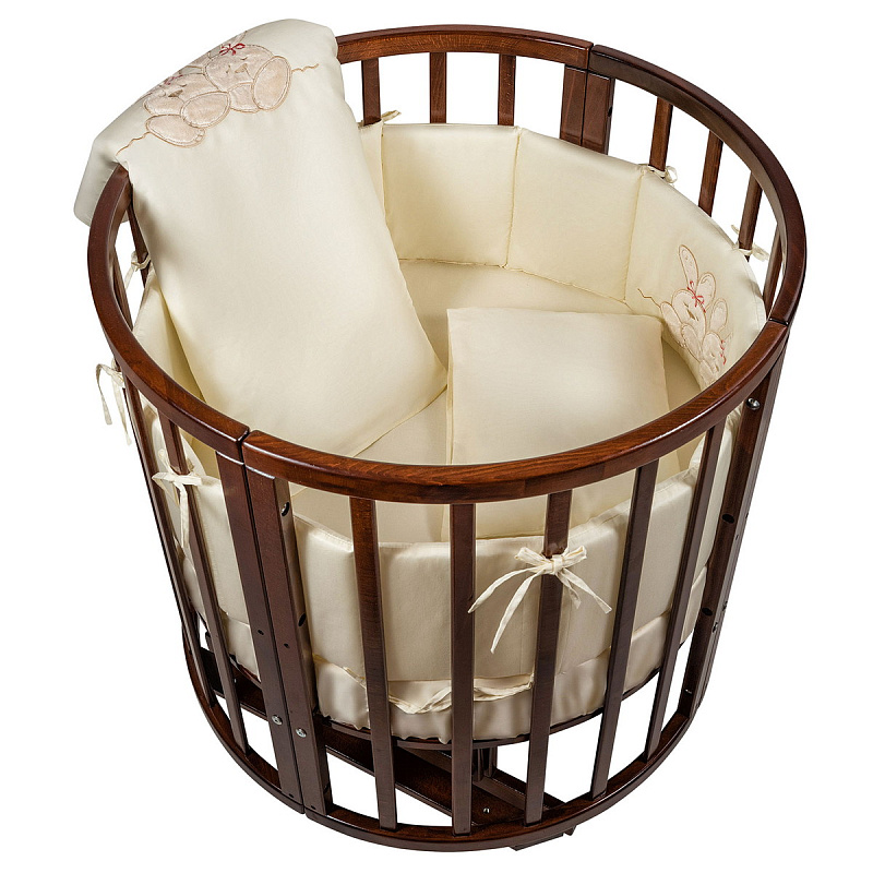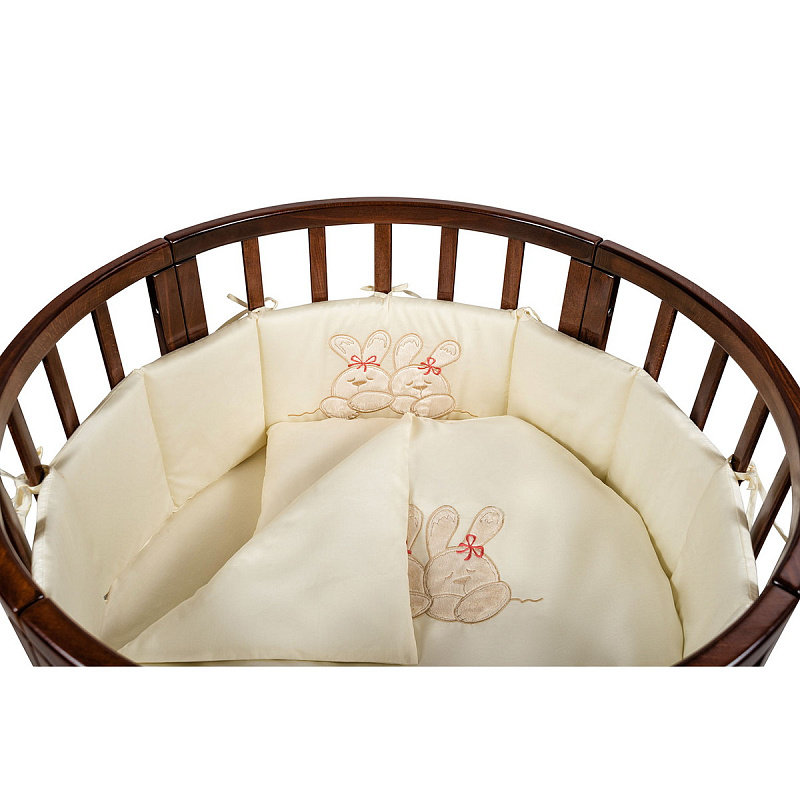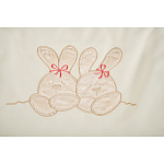 Украшен красивой вышивкой в виде маленьких милых зайчиков и предназначен для колыбелек с круглыми матрасиками.